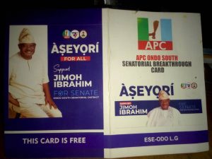 This is to officially call the attention of the Independent National Electoral Commission (INEC), the Nigeria Police Force and most importantly, the general public to the ongoing illegal, clandestine and cunning collection of personal data of Voters’ Cards of the electorates across the six local government areas of Ondo South Senatorial District through the issuance of a purported “Social Welfare Card” christened card ÀSEYORÍ by the members of the ruling All Progressives Congress, (APC) and its Senatorial candidate, Dr Jimoh Ibrahim.