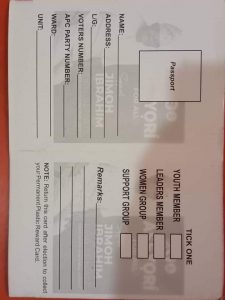 The card specifically demands the applicant’s NAME, ADDRESS, LOCAL GOVERNMENT, VOTERS NUMBER, WARD & UNIT. The implications of this is that the unsuspecting applicants would willingly surrendered the same data and information already supplied to INEC to the APC for easy access and possible software theft of their Voters’ Cards.