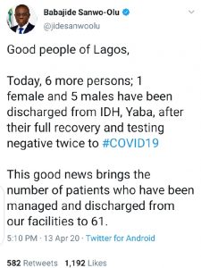 Governor Babajide Sanwo-Olu of Lagos has announced the Recoveries of six new patient of COVID-19 in Lagos state.