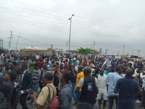 As at 12pm, many of the people who came for the rally could be seen in their hundreds, chanting “Sunday Igboho’s” name while holding the ‘Yoruba Nation Flag’.