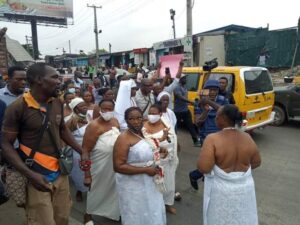 Some women wearing white attire, tied to their chests could be seen addressing the security operatives.
