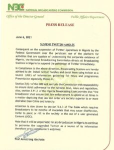 The Federal Government of Nigeria, through the National Broadcasting Commission (NBC), has ordered all broadcasting stations in Nigeria to suspend the use of Twitter.