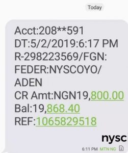 Some Corps Members across the country, especially OYO state (UBA, ACCESS and Zenith Bank) have started receiving their NYSC allowance for the month of April on the evening of Thursday, May 2nd 2019.