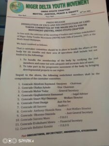 Members of the Ondo state chapter of the Niger Delta Youth Movement(NDYM) have announced the dissolution of their state executives.