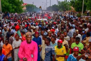 Hundreds of Kano residents matched towards the airport on Sunday afternoon in a solidarity demonstration for Mr Sanusi, whose emirate was divided into five by the state government during the week.